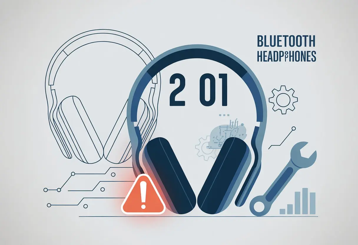 A pair of Bluetooth headphones surrounded by repair icons and digital elements indicating a technical error and troubleshooting process.